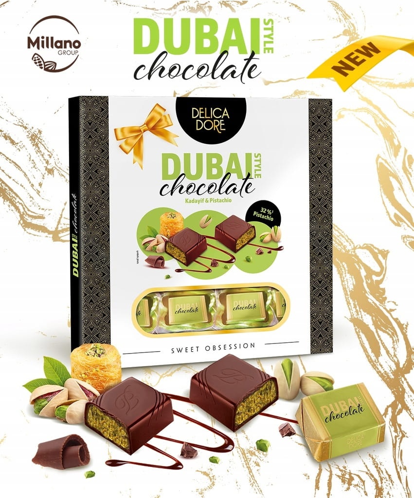 - Wysokiej jakości czekolada otula pistacje oraz kadayif, nadając każdemu kęsowi niezapomnianą konsystencję i głęboki aromat.
